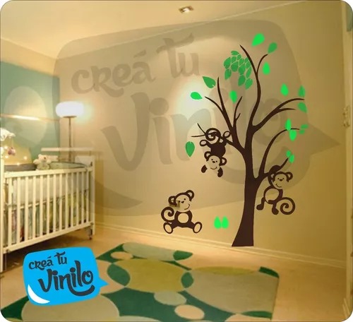 Hermoso vinilo infantil de monitos en un arbol. Medidas: árbol 1,50mts x 88cm, monitos 35cm x 30cm aprox c/u y hojas 2 planchas de 30cm x 25cm c/u. Contiene 3 colores, se deben elegir 2 de ellos.