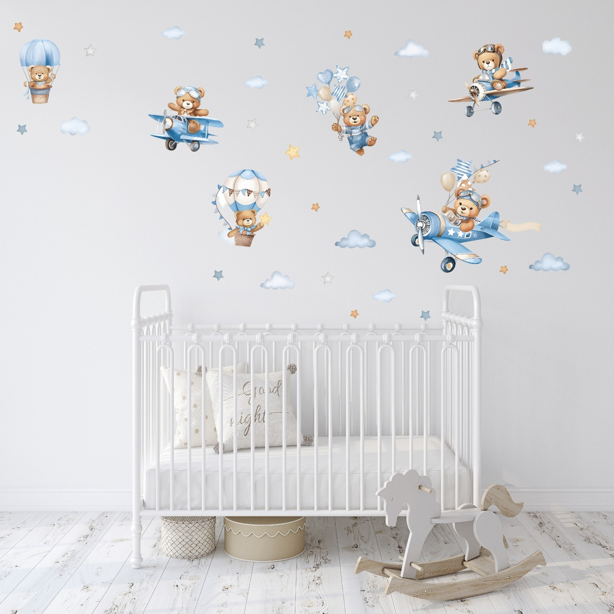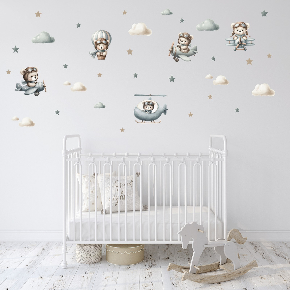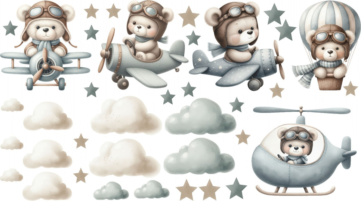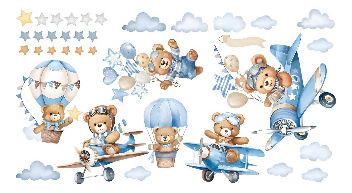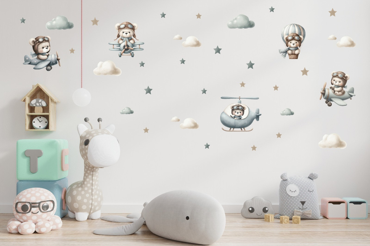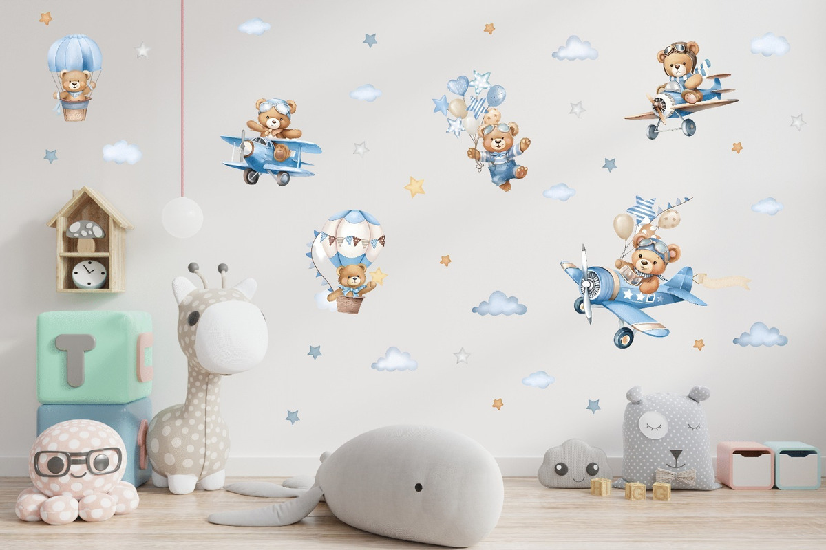 Vinilo Infantil Osito Piloto en Avión con Globos Decorativo Cuarto Bebé